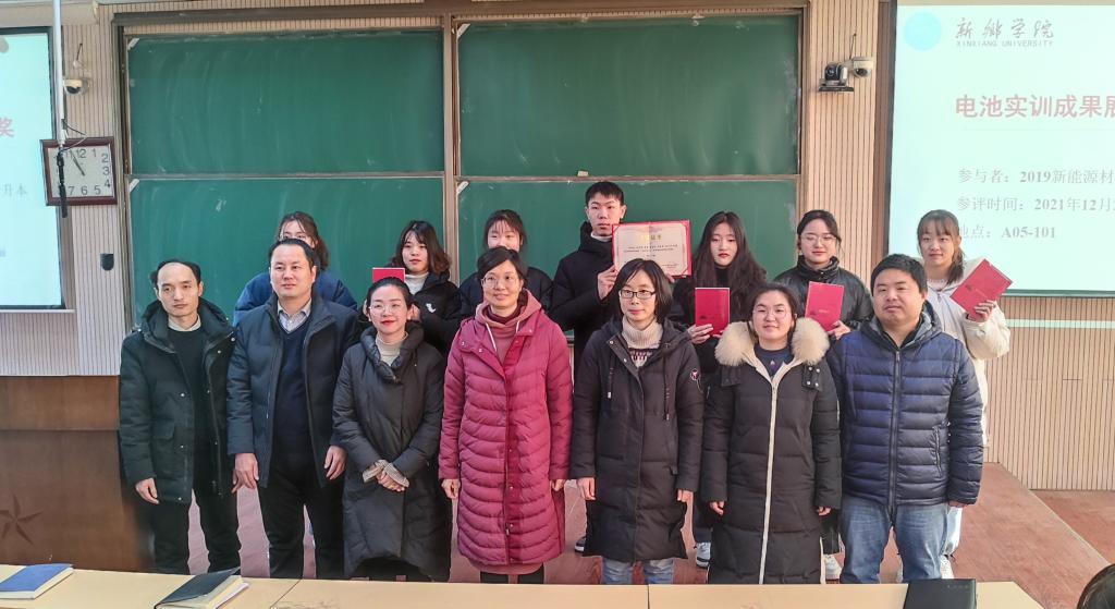 大手牵小手,创新一起走。为了表彰2019级新能源材料与器件专业学生在电池实训上的优异表现,激发大一创新班学生的学习热忱。12月29日上午,我院在A05-101教室举行“电池实训成果展示评选颁奖暨创新班主题班会”。颁奖仪式由副院长郭娇主持,副院长张伟、教学秘书刘振峰、科研秘书谢艳新、新能源材料与器件教研室主任王刘杰以及创新班班主任孙宁波、司江菊博士、2019新能源材料与器件专业和2021级创新班全体同学出席此次会议。