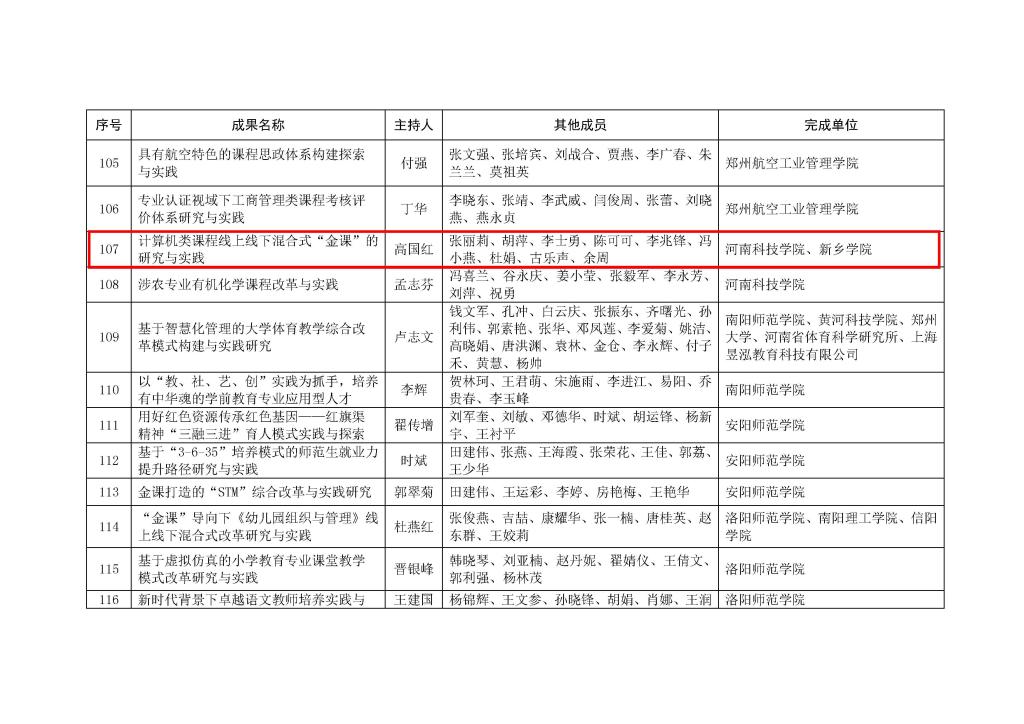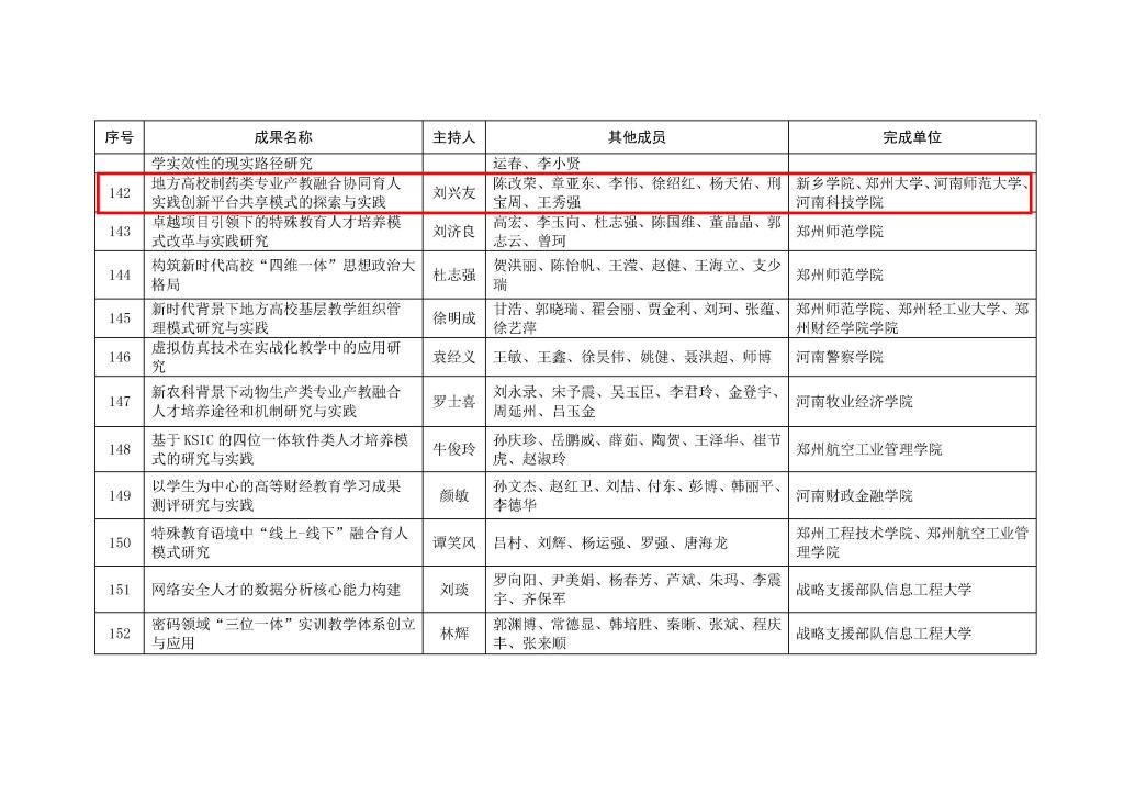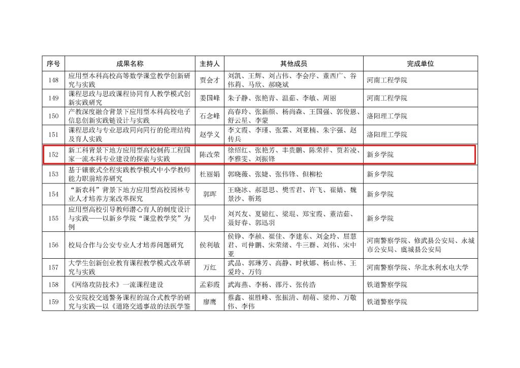 按照河南省高等教育教学成果奖励工作安排,根据《河南省高等教育教学成果奖励办法》和有关申报通知要求,经个人申报、学校推荐,省教育厅组织的专家评审,我院陈改荣教授主持的《新工科背景下地方应用型高校制药工程国家一流本科专业建设的探索与实践》获得2021年度本科高校高等教育教学成果奖二等奖。另外陈可可博士参与的《计算机类课程线上线下混合式“金课”的研究与实践》、陈改荣教授参与的《地方高校制药类专业产教融合协同育人实践创新平台共享模式的探索与实践》分别获得一等奖。