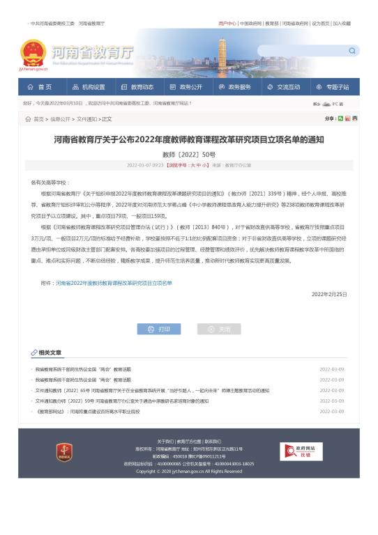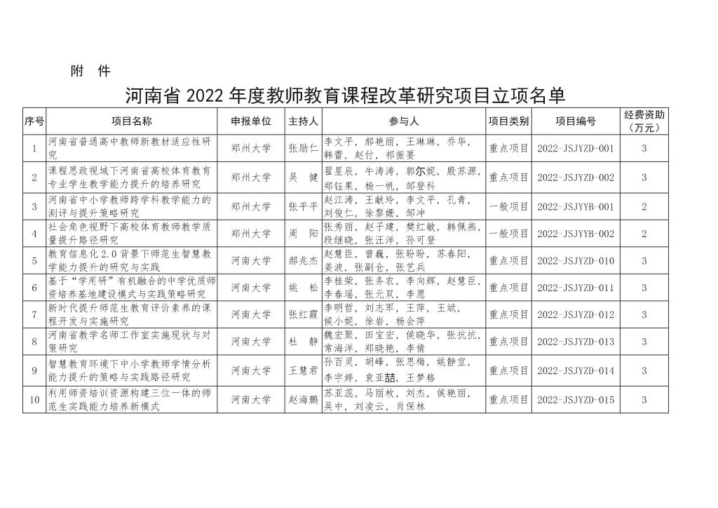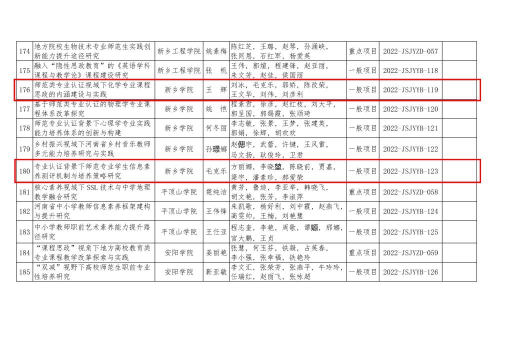 根据河南省教育厅《关于组织申报2022年度教师教育课程改革课题研究项目的通知》(教办师〔2021〕339号)精神,经个人申报、高校推荐、省教育厅组织评审和公示等程序,我院教师王辉申报的课题《师范类专业认证视域下化学专业课程思政的内涵建设与实践》、毛克乐申报的课题《专业认证背景下师范专业学生信息素养测评机制与培养策略研究》分别获批河南省2022年度教师教育课程改革研究项目。