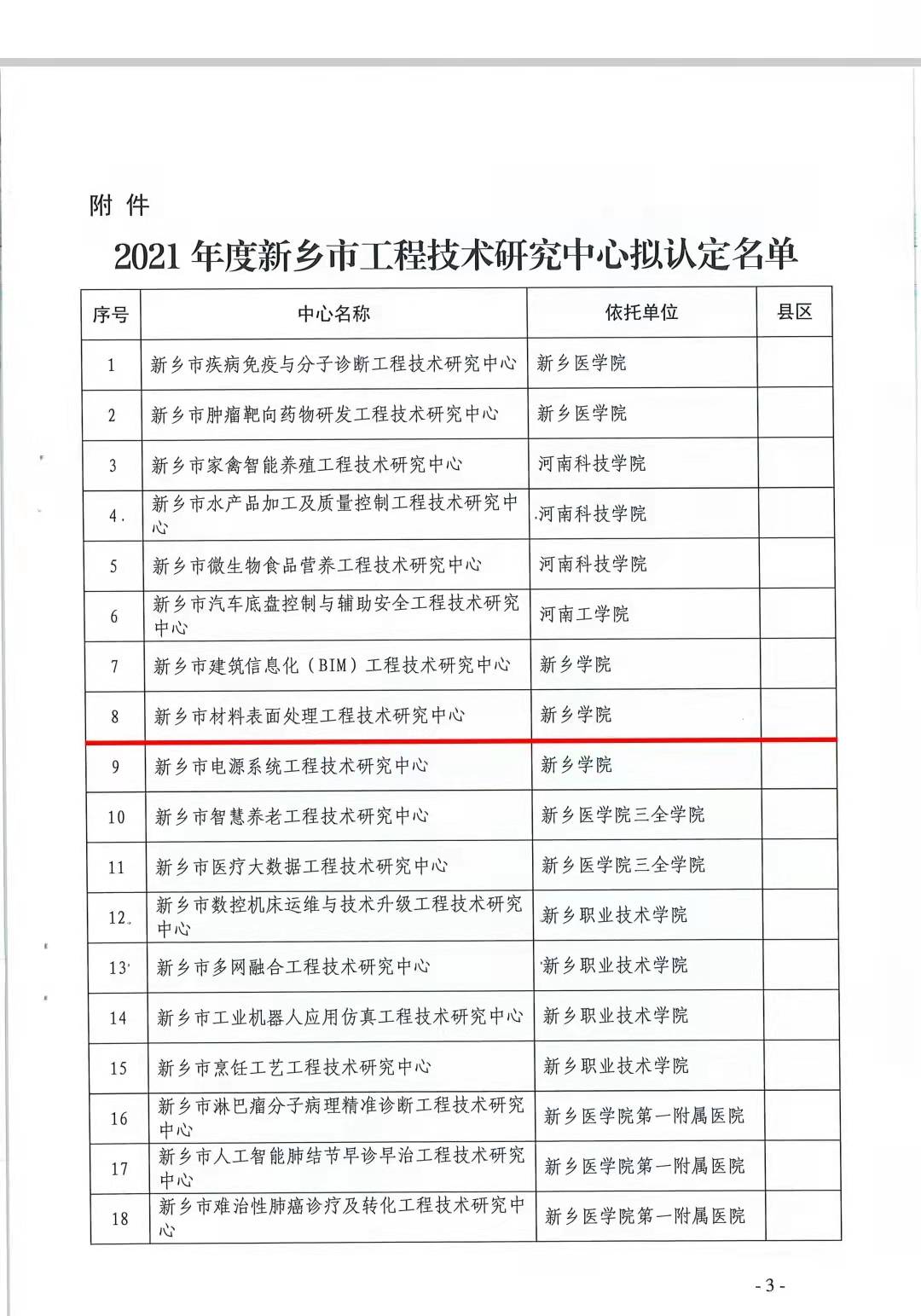 根据新乡市科技局《关于认定2021年度新乡市工程技术研究中心的通知》(新科〔2022〕5号)和《新乡市工程技术研究中心管理暂行办法》(新科计〔2016〕33号)有关规定,经专家会议评审、媒体公示等程序,我院申报的材料表面处理工程技术研究中心被认定为新乡市工程技术研究中心。