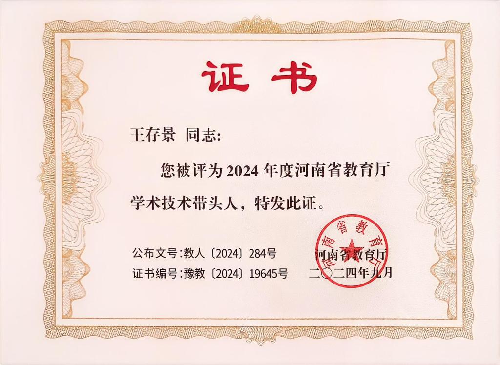 王存景副教授被评为2024年度河南省教育厅学术技术带头人。