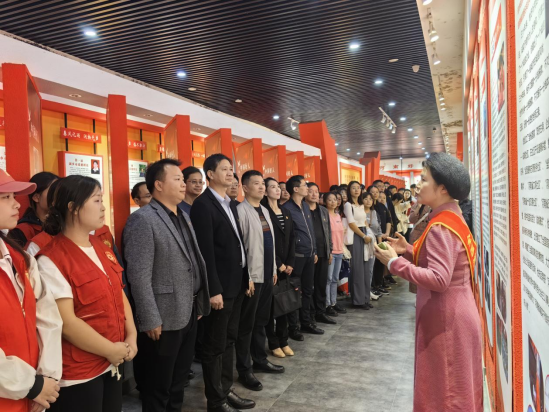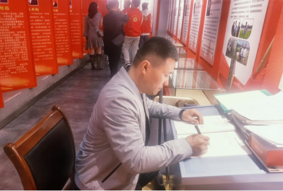 新乡好人馆集中展示了新乡道德模范、身边好人的感人事迹,是新时代新乡市民精神文明建设的重要阵地。首先,全国道德模范提名奖获得者买世蕊为我们讲述了她从事公益多年的事迹,她始终强调:“我只是做了一些微不足道的小事儿。”却坚持用实际行动诠释着大爱。随后,“买大姐”在讲解道德模范和身边好人的事迹时,有感而发的带领大家合唱《我和我的祖国》,表达了对祖国真挚的爱。全体党员都被“买大姐”讲述的人物事迹深深打动,纷纷表示他们都是身边可以学、能够学的标杆,真正领悟了“存好心,说好话,做好事,当好人”的意义,让全体党员上了一堂发人深思的党课。最后,王艳博书记也应志愿者邀请,为新乡好人馆留言:“感悟颇深,向好人学习、宣传正能量、为新乡争光。”