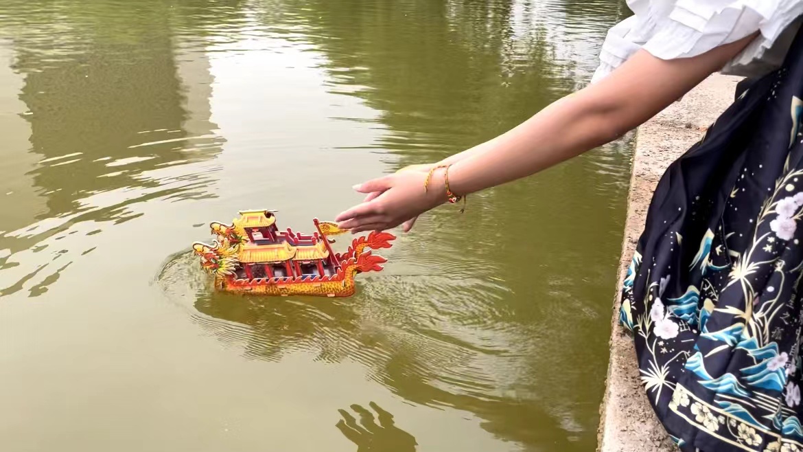 学生在和谐湖中放纸质龙舟,顺流而下的龙舟是对屈原的纪念,同时也表达了学生们对幸福、平安的祈求。
