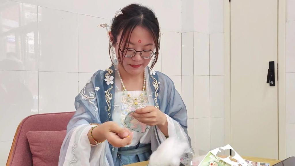 老师和学生在系楼大厅制作香囊和漆扇,一针一线包含着浓浓的祝福,点点彩墨绘出对美好的向往。