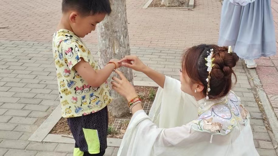 学生沿着和谐湖漫步,给路上的学生赠送并佩戴五彩绳,宣传端午节习俗,传达端午节祝愿。