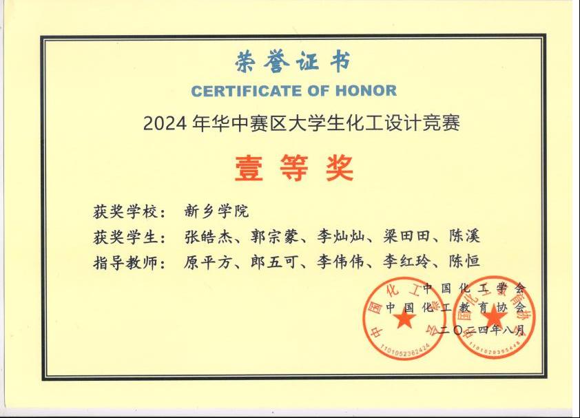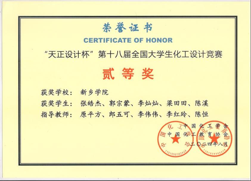 近日,2024年第十八届全国大学生化工设计竞赛落幕,我院张皓杰、郭宗蒙、李灿灿、梁田田、陈溪5名同学组成的“炉火醇青”团队荣获全国二等奖、华中赛区一等奖。