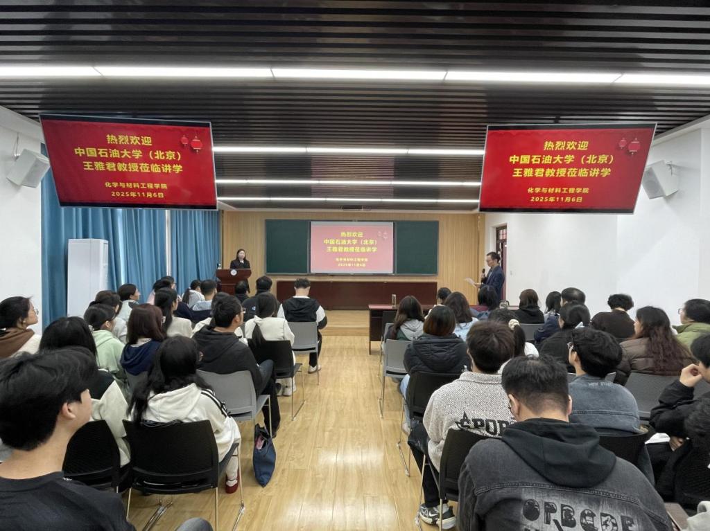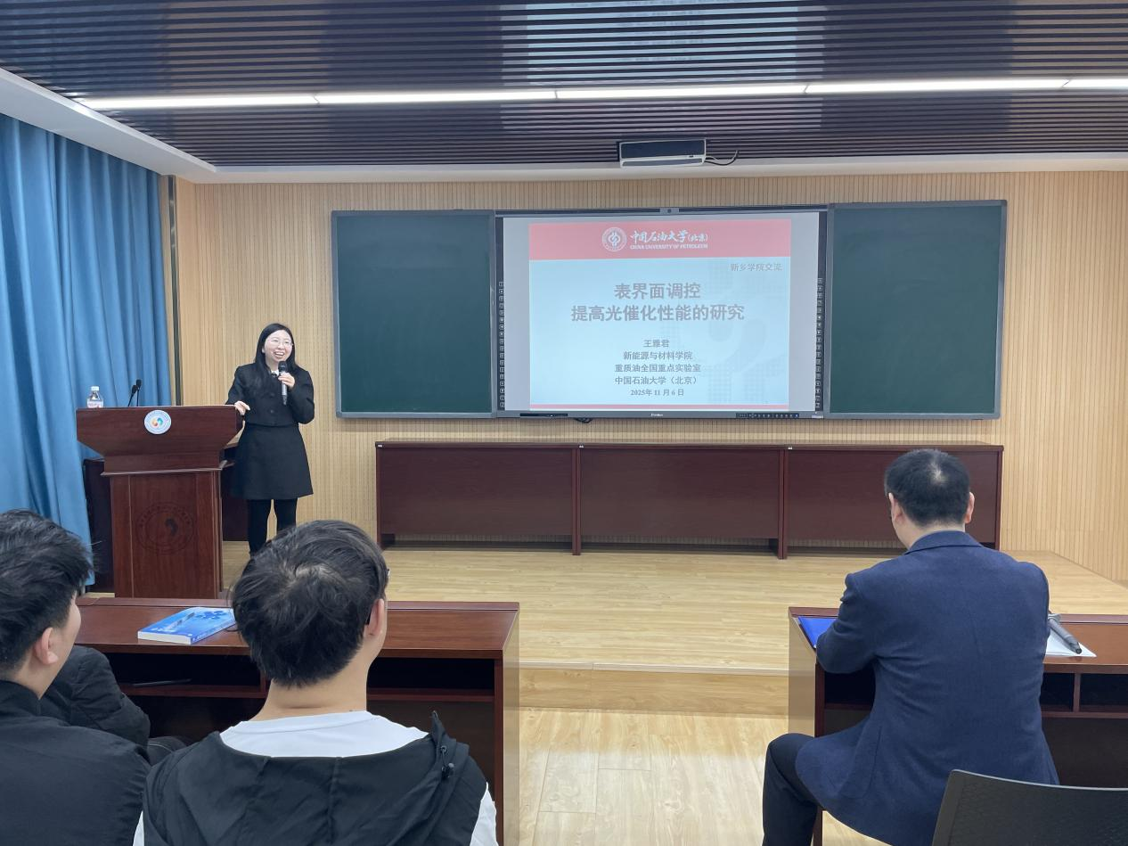 11月6日上午,中国石油大学(北京)王雅君教授应邀在A15-212报告厅作了题为“表界面调控提高光催化性能的研究”的学术报告。williamhill中国院长周建伟教授主持报告会,学院青年教师、研究生及本科生代表共100余人参加报告会。