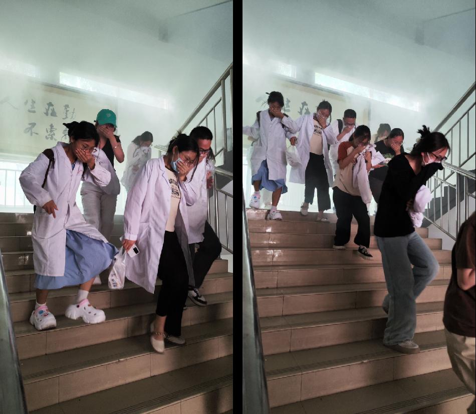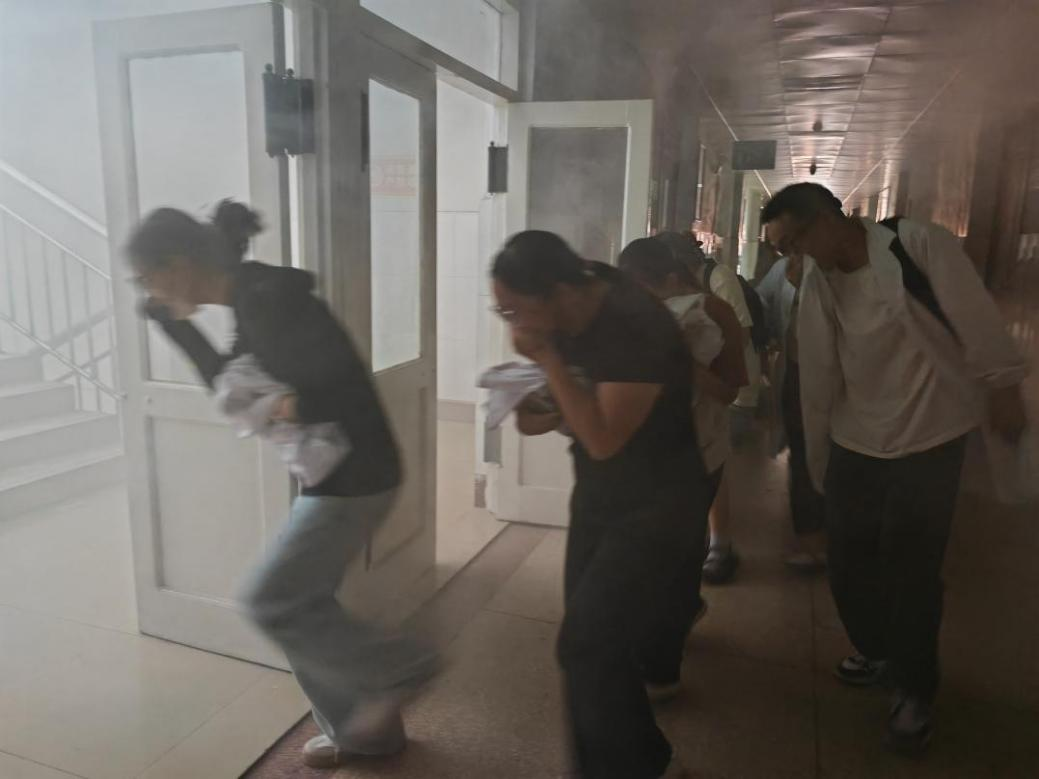 6月7日上午10:00,我院在A15教学楼开展消防应急疏散演练,以316实验室为模拟火灾地点,随着警报声响起,现场浓烟滚滚,面对“突发的火情”,大家按照指示用湿毛巾捂住口鼻,压低身体迅速从消防通道撤离,抵达室外安全区域。撤离过程中,师生反应敏捷、行动迅速规范、撤离井然有序。