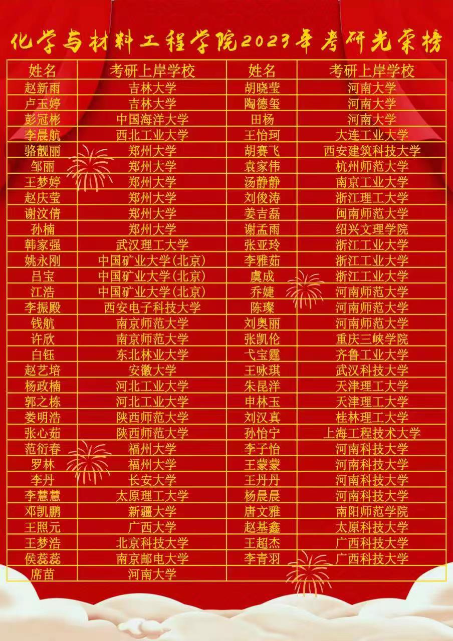 我院2023届毕业生共63位同学顺利考取硕士研究生,上岸院校中985、211、“双一流”高校占比达到56%,其中有吉林大学、中国海洋大学、西北工业大学、郑州大学、中国矿业大学等高校。